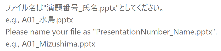 - ファイル作成の注意点:講演で使用可能なファイル形式はPowerpointになります。会場で使用するPCのOSはWindowsです。Macをご使用の方は提出前にWindows機で正しく表示されることを確認してください
